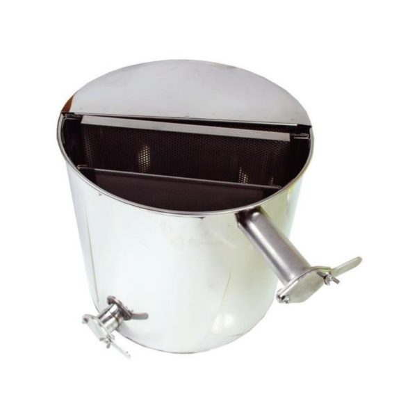 Lingon alle tarkoitettu siivilä. Kaksi siivilälevyä pystyssä. Kaksi hanaa. Tarkoitus on ottaa puhdas hunaja ylähanasta. Vaha ehtii kerrostua pintaan, jolloin siivilä ei tukkeennu niin nopeasti. Astia käy myös pakkausastiaksi.
